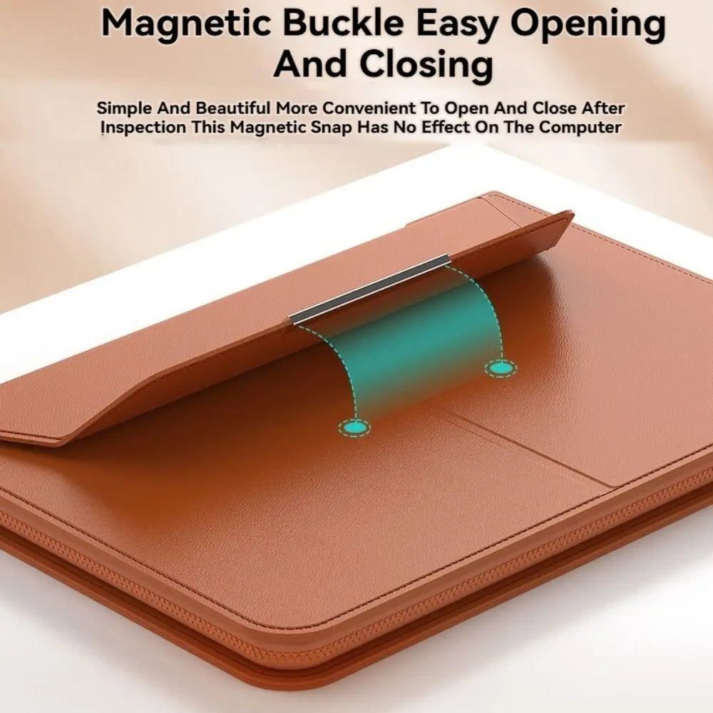Elevate your workspace with this premium leather laptop sleeve, featuring an automatic magnetic closing design and a built-in stand for ergonomic comfort. Designed for 13–16 inch laptops, it’s a perfect blend of elegance and functionality.
