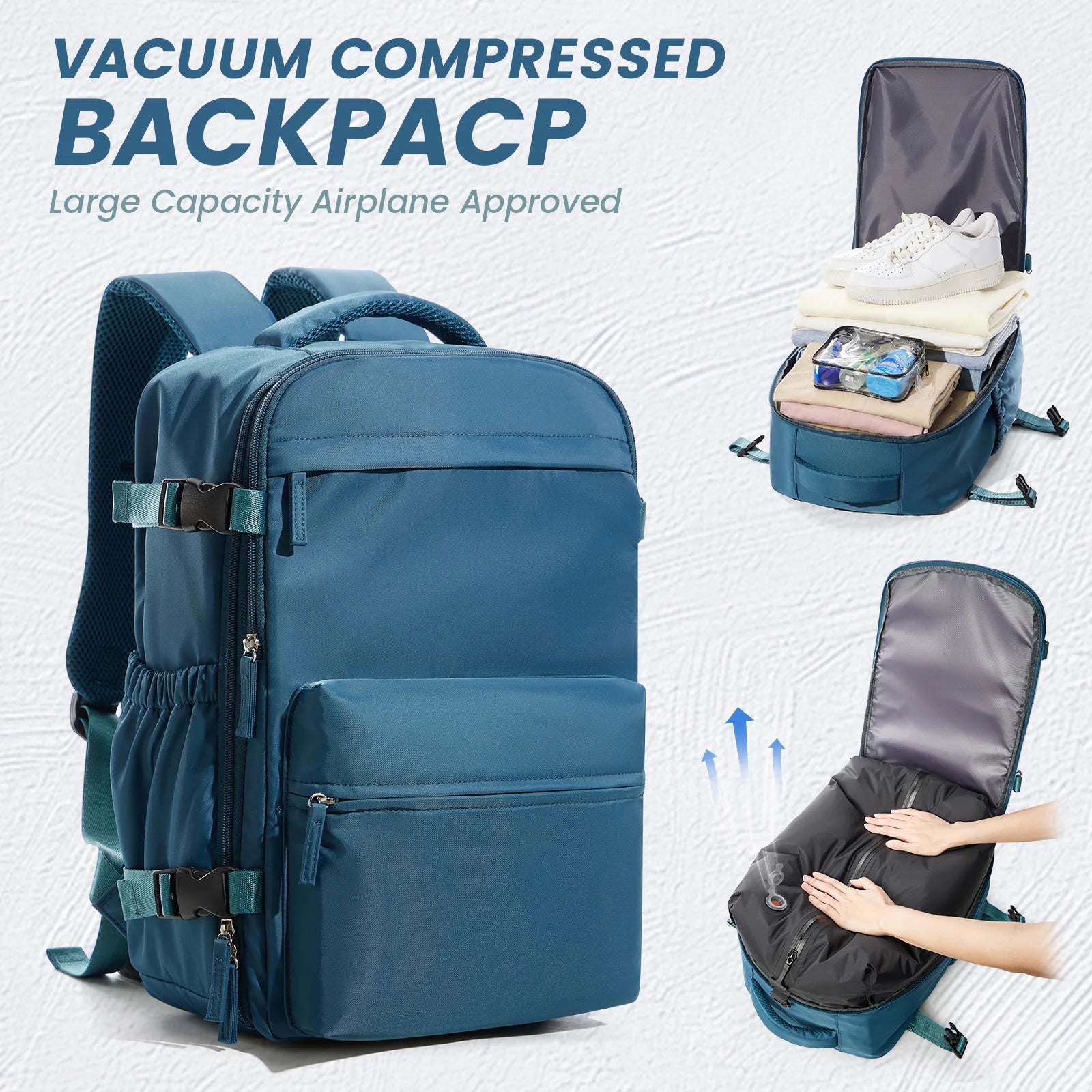 Airline-approved vacuum compression backpack with dedicated 15.6" laptop space and vacuum storage section. Fits Ryanair 40x20x25 cm cabin size. Ideal for business, travel, and compact packing.