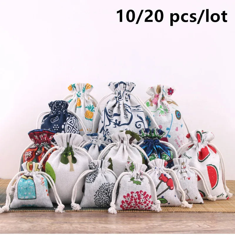Adorable cartoon print linen drawstring bags in a compact 10x14cm size. Perfect for gifts, party favors, and jewelry. Eco-friendly cotton fabric with secure closure. Pack of 10 or 20