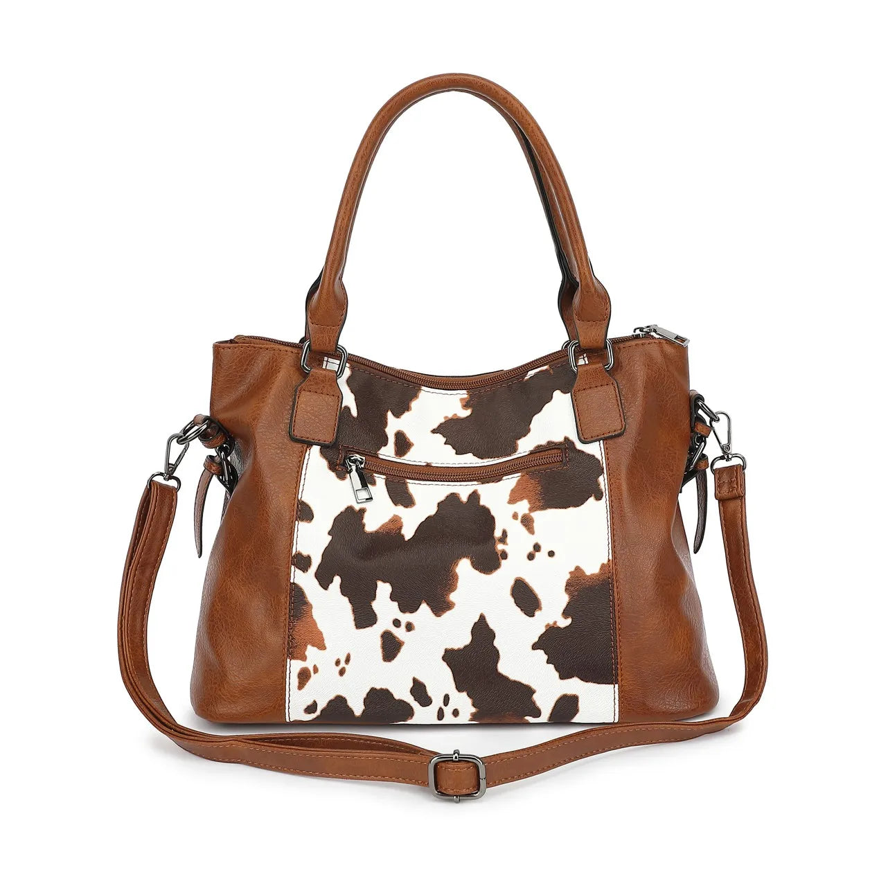 Stylish cow print tote handbag set for women. Features multi-pocket design and large capacity. A trendy, practical choice for daily use with a unique classic pattern