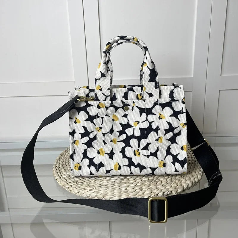 Stylish floral-print cargo tote with vintage European charm. Features full daisy print, top handle, and crossbody strap. Compact yet spacious—perfect for casual or chic outfits