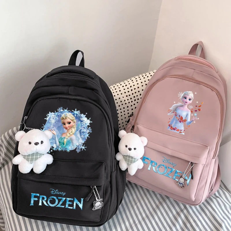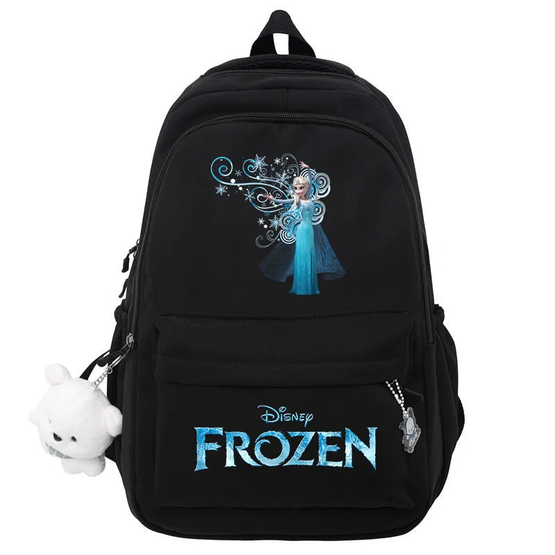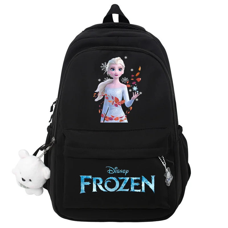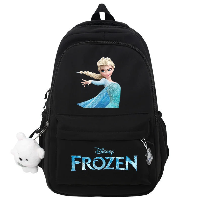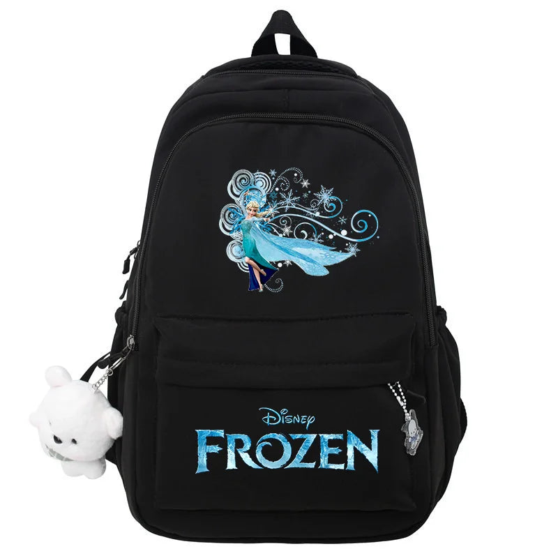 Sleek black Frozen backpack with Anna & Elsa print – ideal for teens, students, and college use