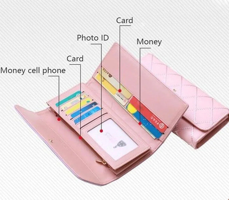 Chic plaid PU leather long wallet for women in a cute pink design, featuring hasp closure, spacious compartments for phone, coins, cards, and cash—perfect for daily use