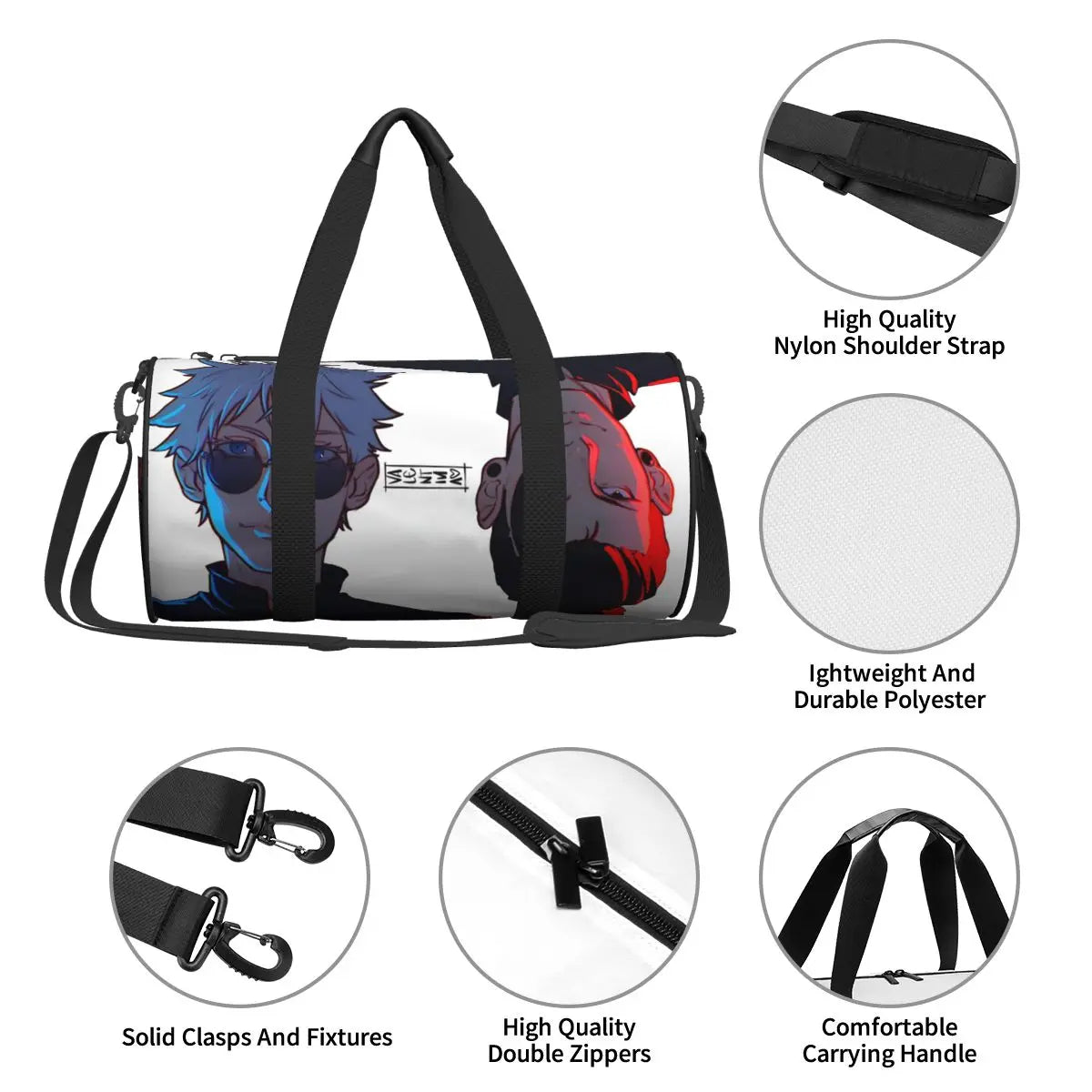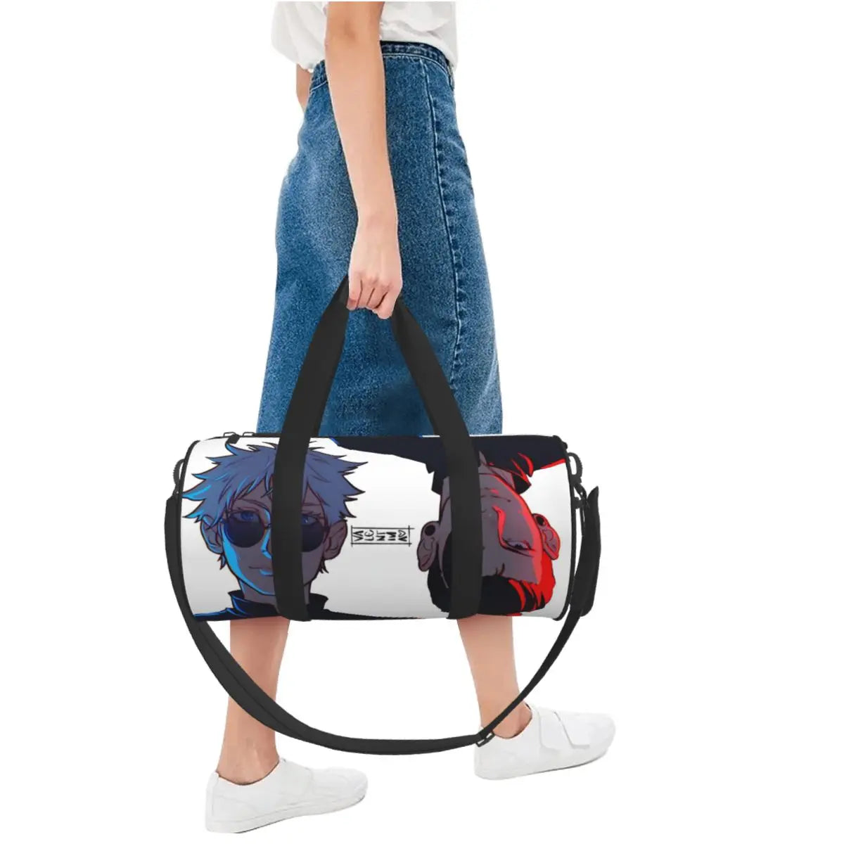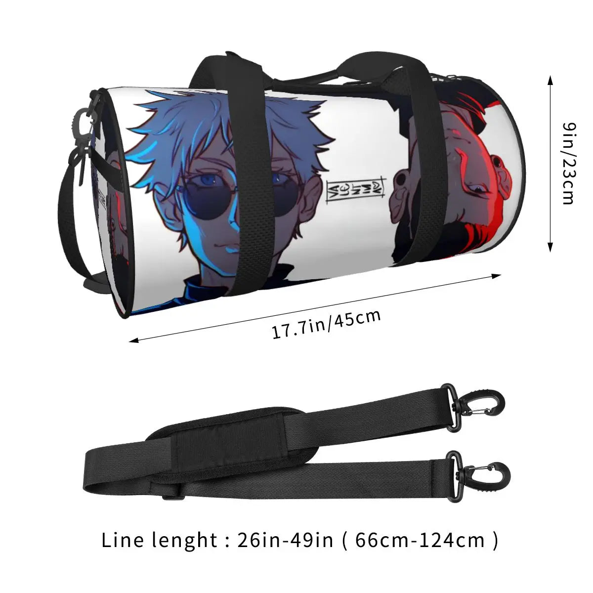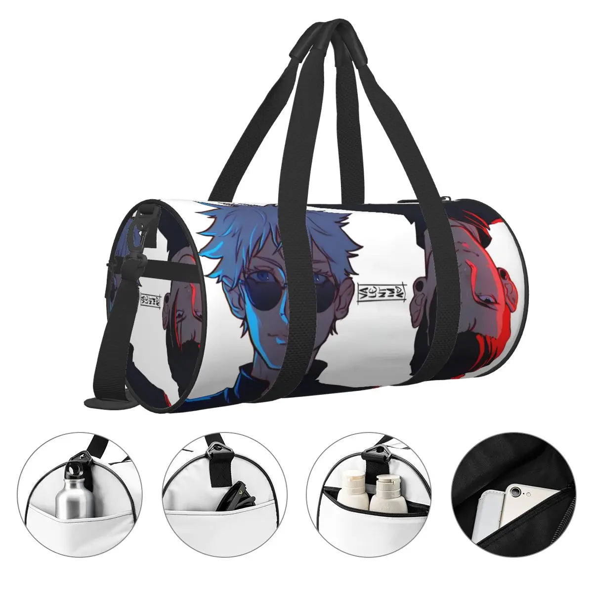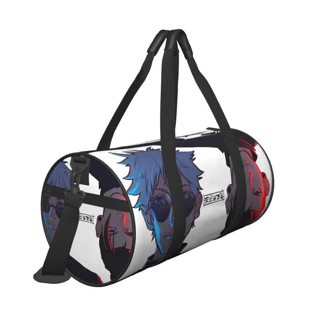 Stylish Satoru Gojo anime sports bag with vibrant print. Includes shoe compartment, spacious interior, and portable design. Ideal for gym, travel, training, or couples’ use