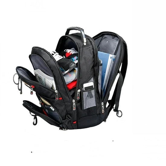 A spacious, waterproof travel backpack for men with USB charging port, designed to hold up to a 23-inch laptop — ideal for business, school, or weekend travel