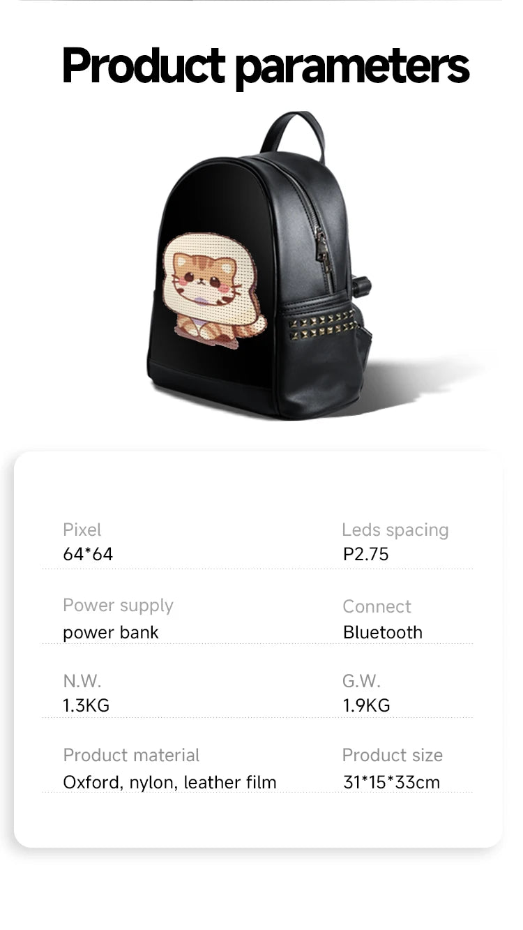 The Moto LED Backpack combines fashion and technology, featuring a smart LED display you can customize via APP. Perfect as a holiday gift or for everyday use, this shoulder bag offers style, safety, and versatility.