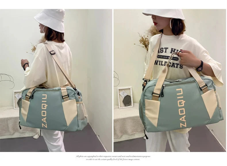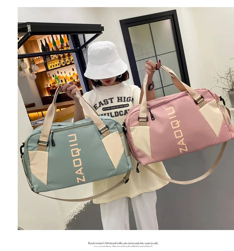 Durable and spacious sports gym bag designed for women, featuring shoe storage, multiple pockets, and a convenient shoulder strap for fitness and travel