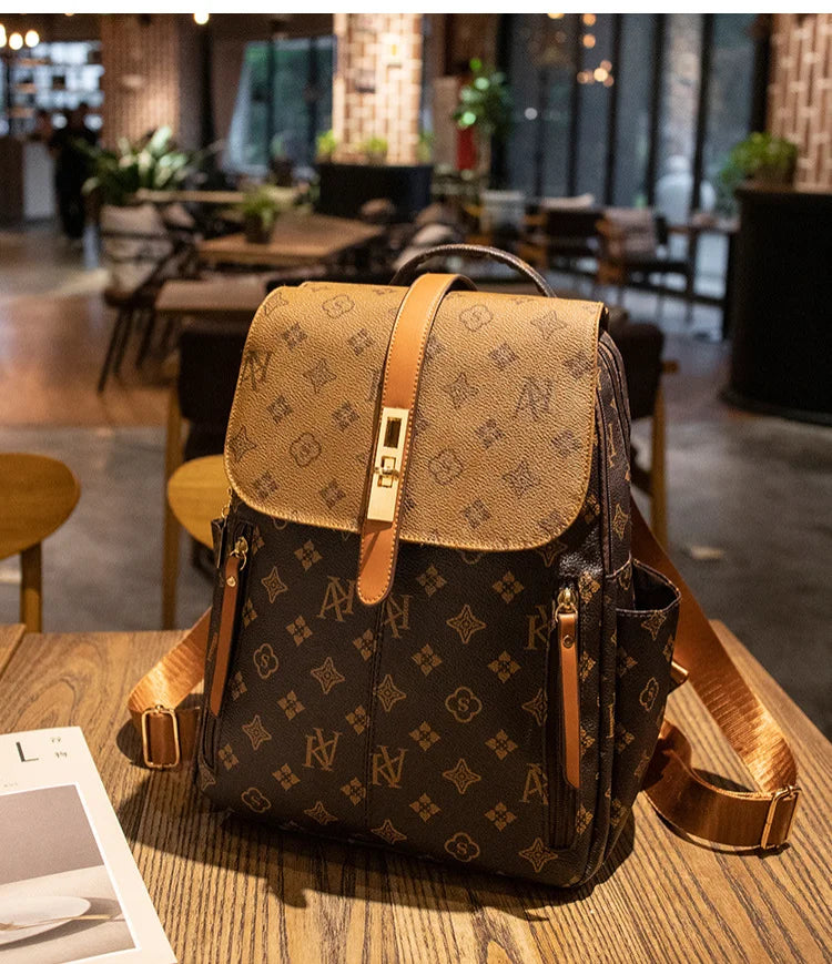 Stylish vintage-inspired women's backpack with large capacity, fashion print accents, and a secure metal lock ideal for commuting and travel